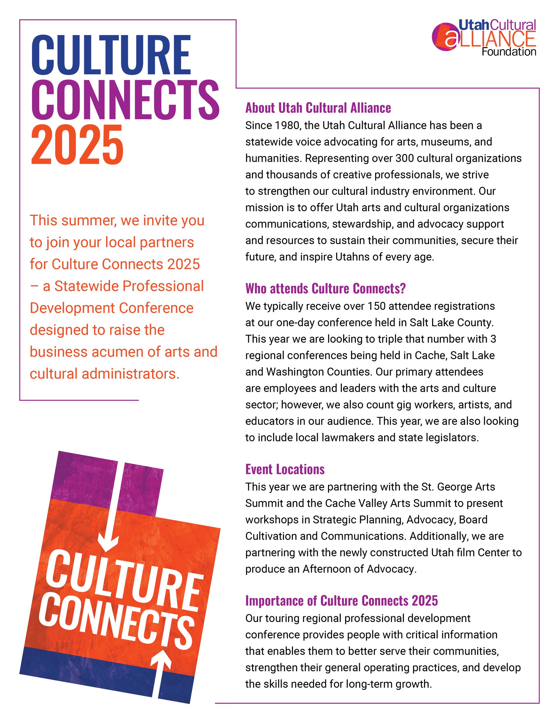 Stay tuned for the official Culture Connects 2025 launch, including a fresh new look, and updates on all three events. Let’s build a stronger cultural future for all Utahns—together.